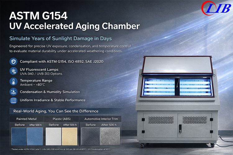 صناعة LIBتوفر غرف اختبار ASTM G154 عالية الدقة مصممة من أجل المتانة والاستقرار والتخصيص. تشمل المزايا الرئيسية:
