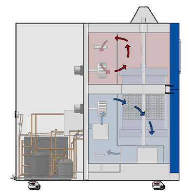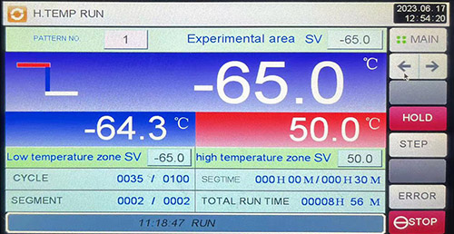 في منطقة درجة الحرارة المنخفضة ، يمر المبرد عبر صمام خنق في المبخر داخل الغرفة. هنا ، يمتص الحرارة من بيئة الاختبار ، ويتبخر ، ويتم سحبه مرة أخرى إلى الضاغط. تتيح هذه الدورة التبريد السريع إلى-65 درجة مئوية ، مع الشفاء الكامل في أقل من 5 دقائق. تضمن العملية تعرضًا دقيقًا وموثوقًا بدرجة حرارة منخفضة لكل عينة اختبار.