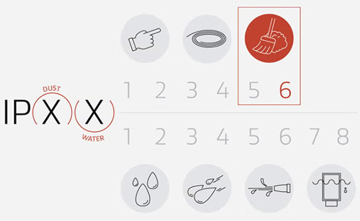 الرقم الأول (0-6):حماية صلبة من الجسيمات ، حيث تتصل 5 و 6 على وجه التحديد بمقاومة الغبار.